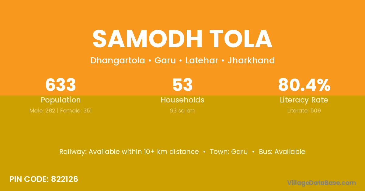 Samodh Tola village has a total population of 633 people, of which 282 are males and 351 are females.