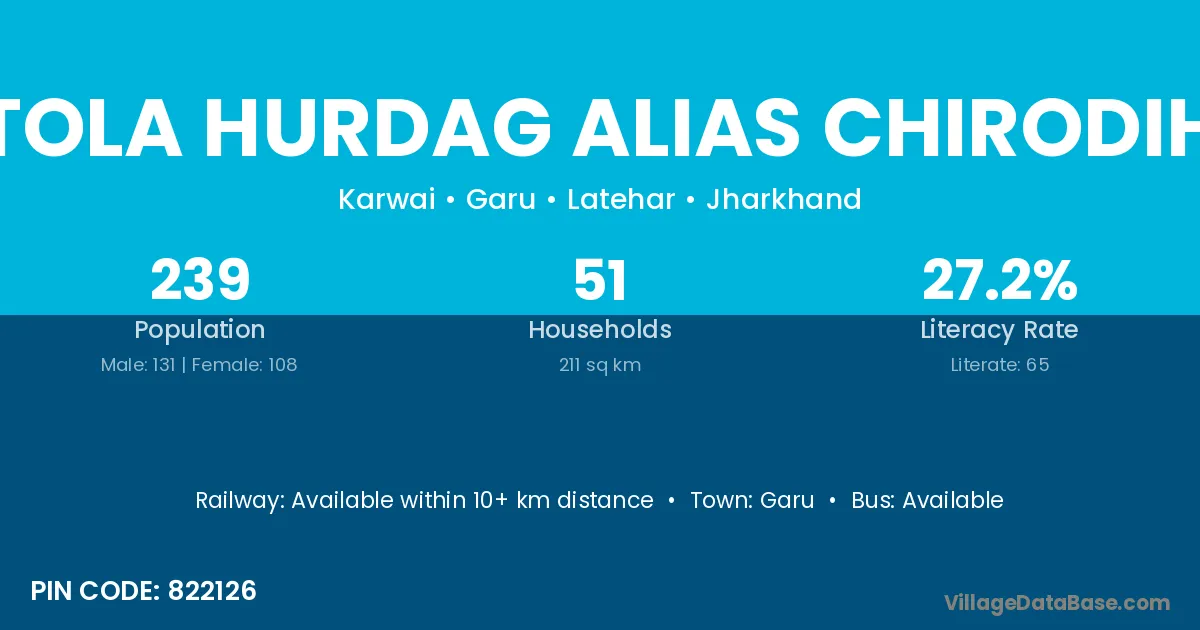 Tola Hurdag Alias Chirodih village has a total population of 239 people, of which 131 are males and 108 are females.