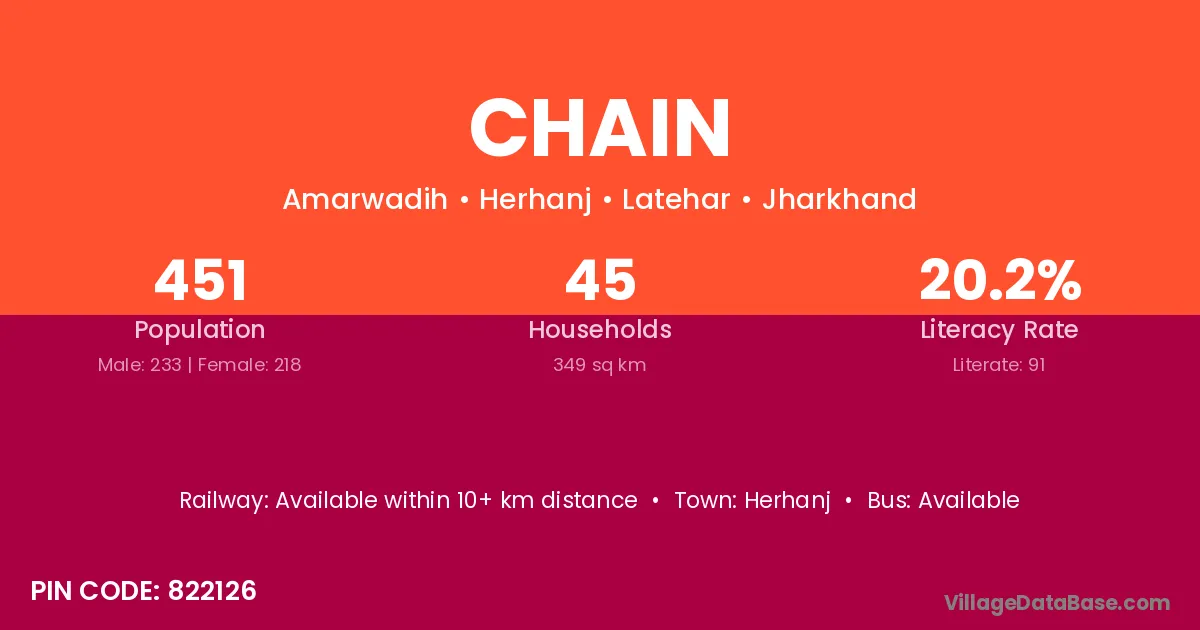 Chain village has a total population of 451 people, of which 233 are males and 218 are females.