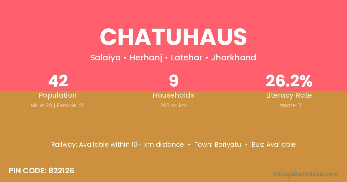 The literacy rate of Chatuhaus village is 26.19%. Male literacy stands at 40.00% and female literacy at 13.64%.