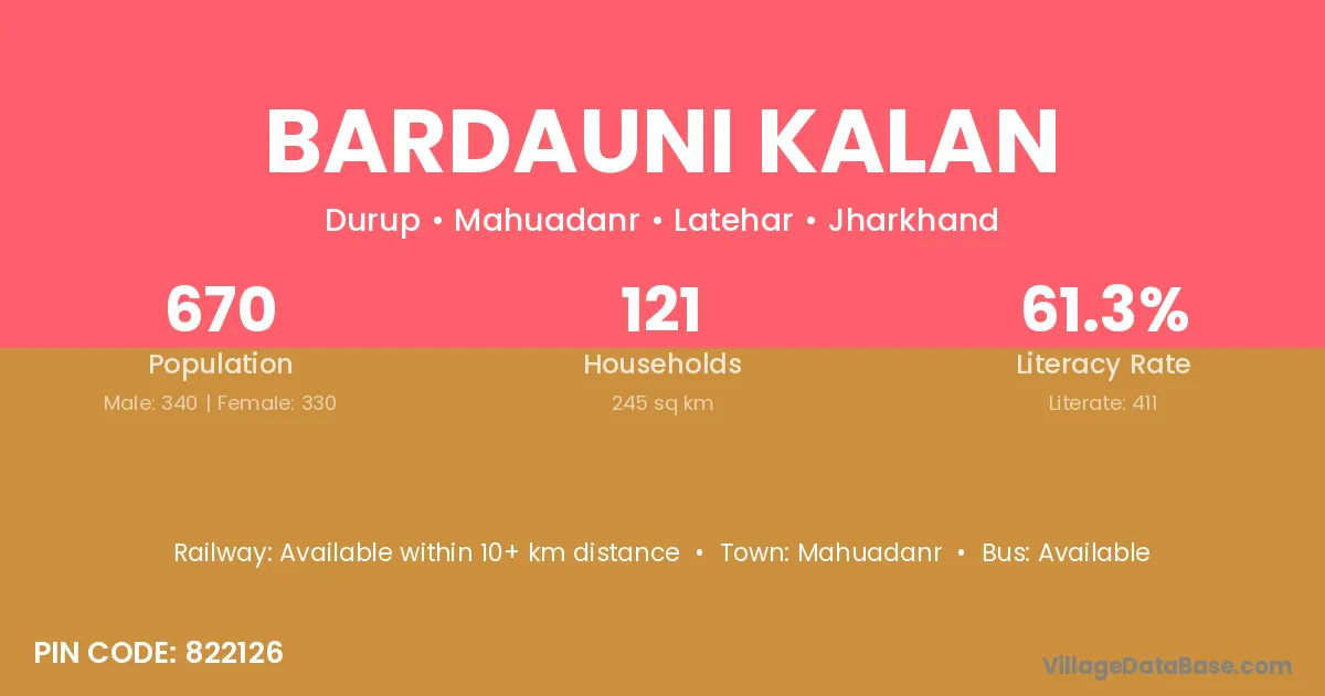Bardauni Kalan village has a total population of 670 people, of which 340 are males and 330 are females.