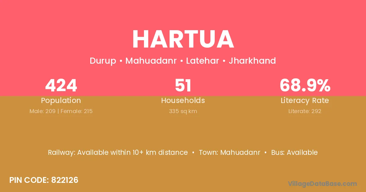 Hartua village has a total population of 424 people, of which 209 are males and 215 are females.