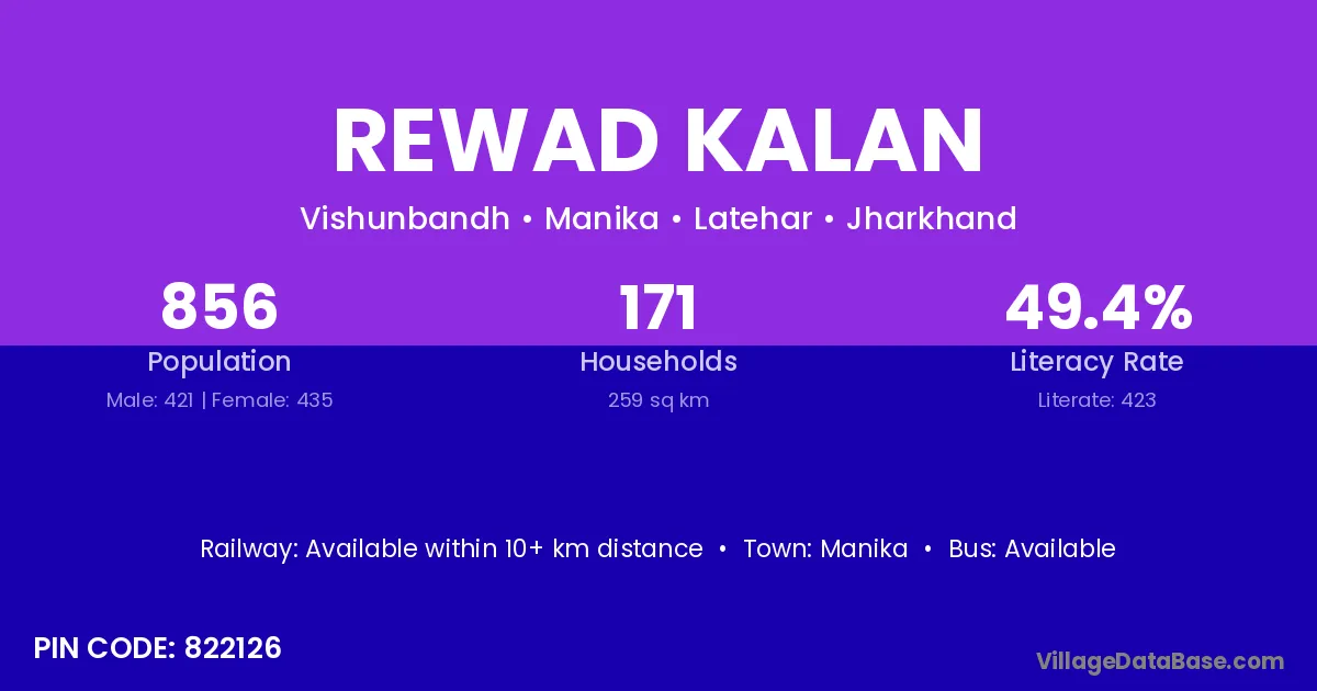 Rewad Kalan village has a total population of 856 people, of which 421 are males and 435 are females.