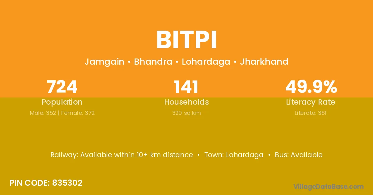 Bitpi village has a total population of 724 people, of which 352 are males and 372 are females.