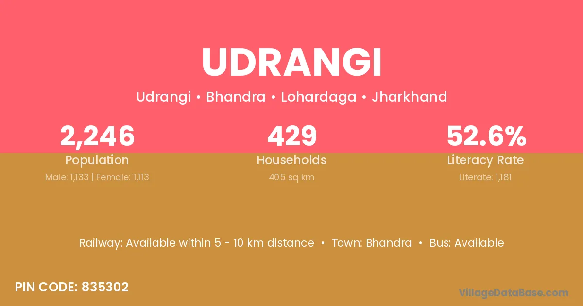 Udrangi village has a total population of 2,246 people, of which 1,133 are males and 1,113 are females.