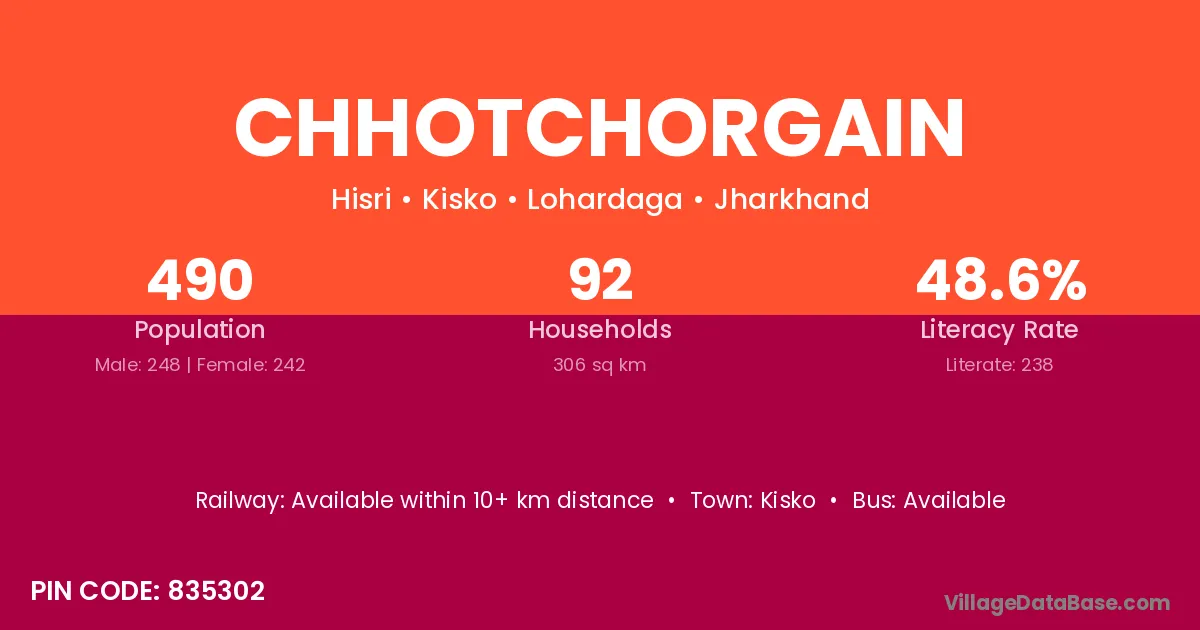 Chhotchorgain village has a total population of 490 people, of which 248 are males and 242 are females.