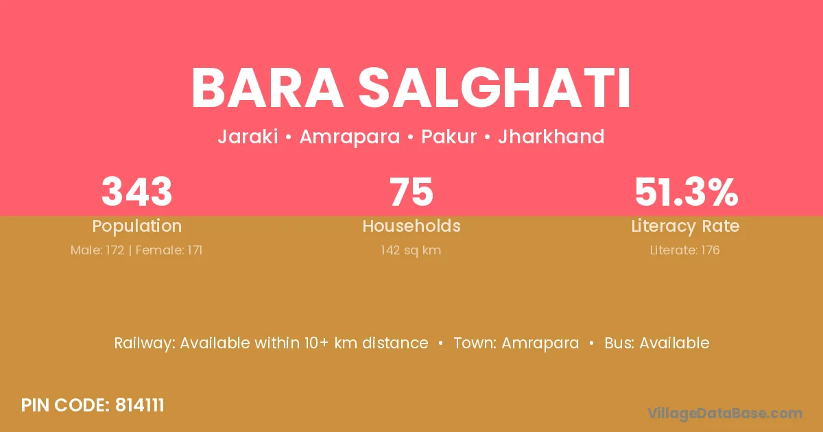 Bara Salghati village has a total population of 343 people, of which 172 are males and 171 are females.