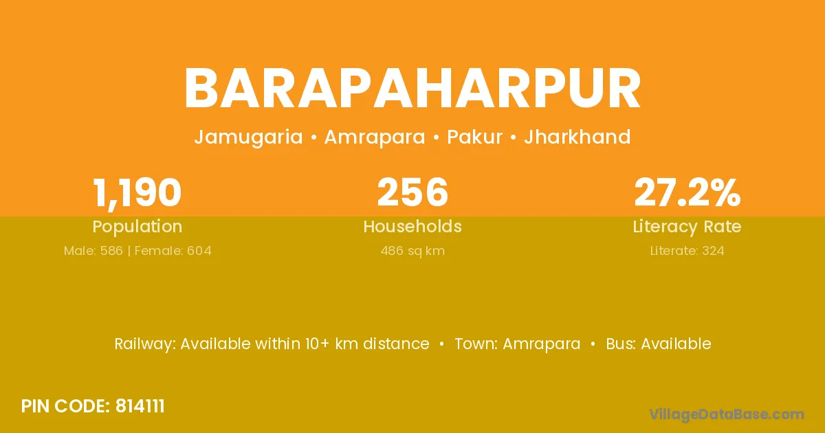 Barapaharpur village has a total population of 1,190 people, of which 586 are males and 604 are females.