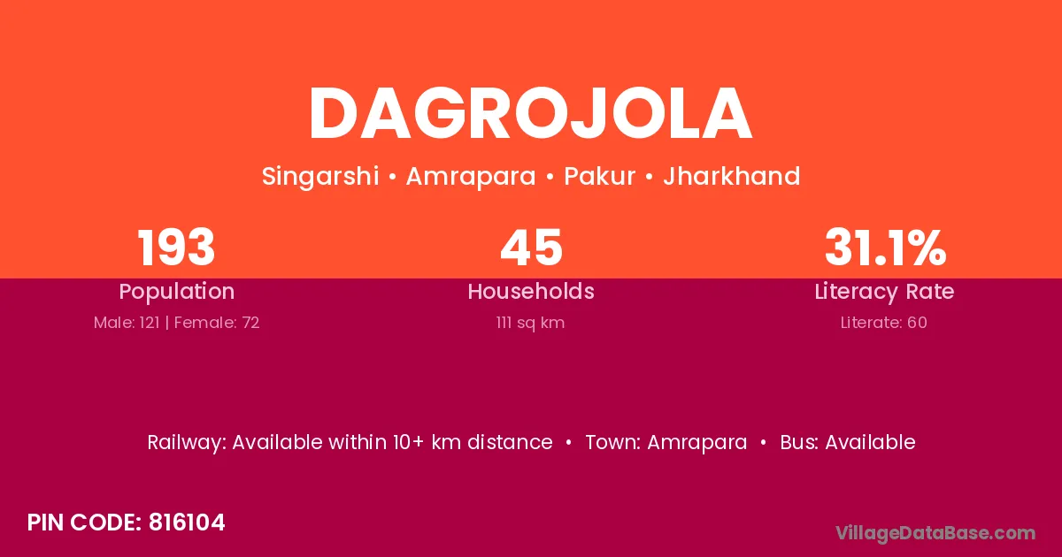 Dagrojola village has a total population of 193 people, of which 121 are males and 72 are females.