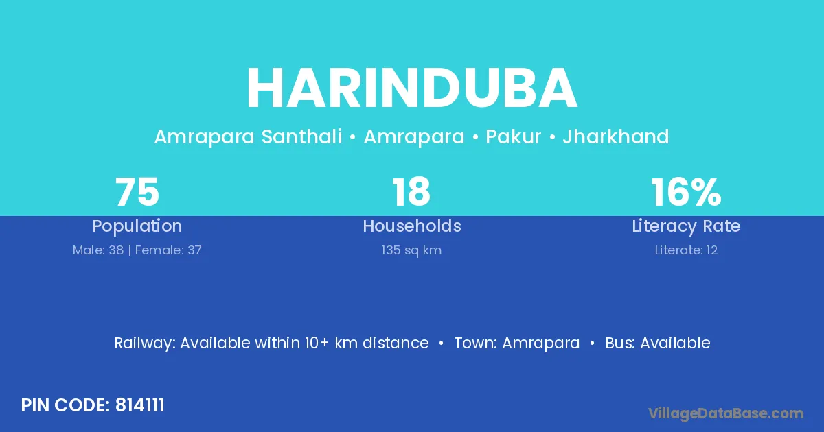 Harinduba village has a total population of 75 people, of which 38 are males and 37 are females.