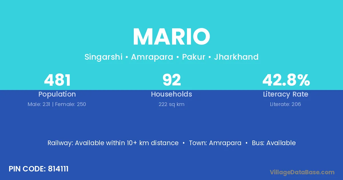 Mario village has a total population of 481 people, of which 231 are males and 250 are females.