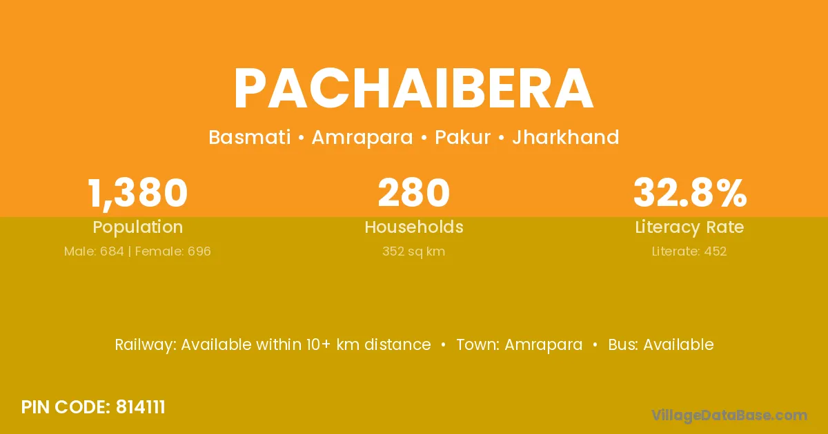 Pachaibera village has a total population of 1,380 people, of which 684 are males and 696 are females.