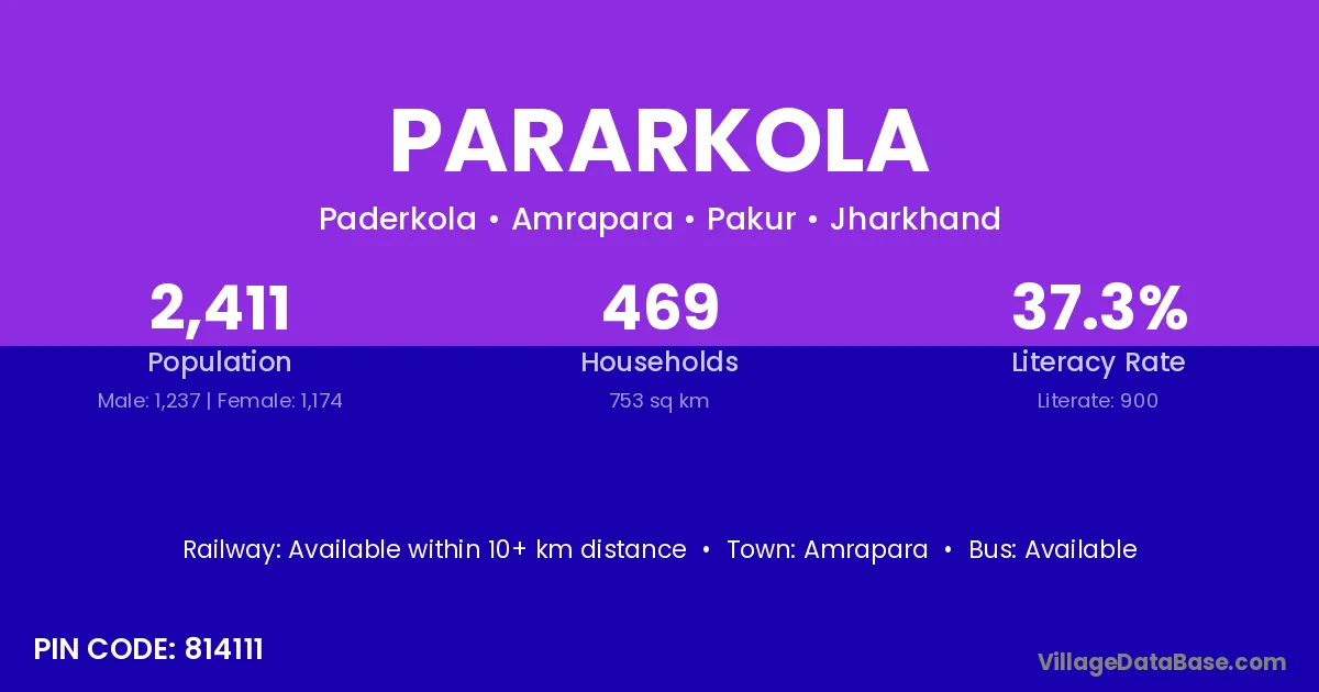 Pararkola village has a total population of 2,411 people, of which 1,237 are males and 1,174 are females.