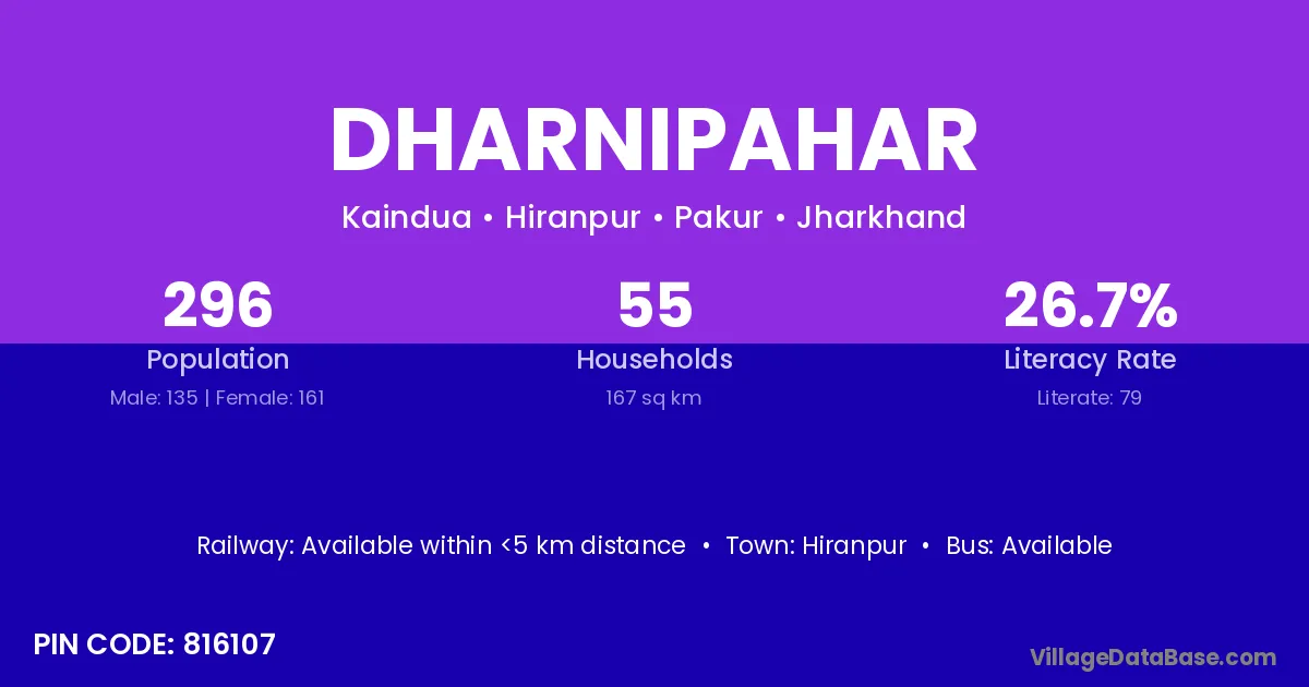 Dharnipahar village has a total population of 296 people, of which 135 are males and 161 are females.