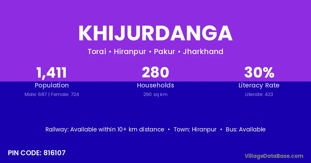 Khijurdanga village has a total population of 1,411 people, of which 687 are males and 724 are females.