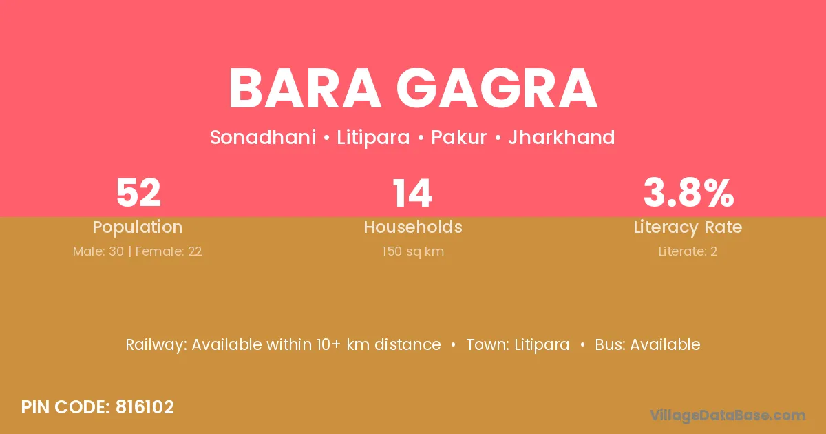 Bara Gagra village has a total population of 52 people, of which 30 are males and 22 are females.