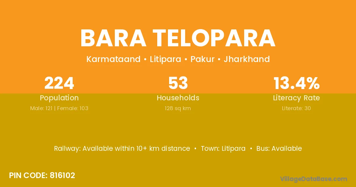 The literacy rate of Bara Telopara village is 13.39%. Male literacy stands at 16.53% and female literacy at 9.71%.