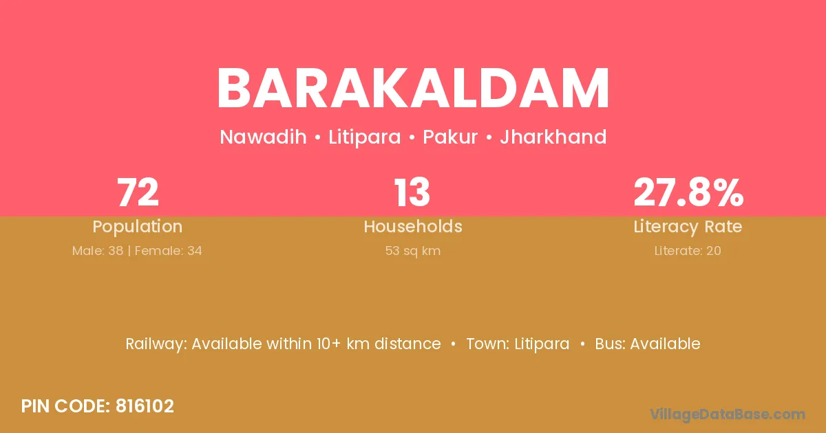 The literacy rate of Barakaldam village is 27.78%. Male literacy stands at 44.74% and female literacy at 8.82%.