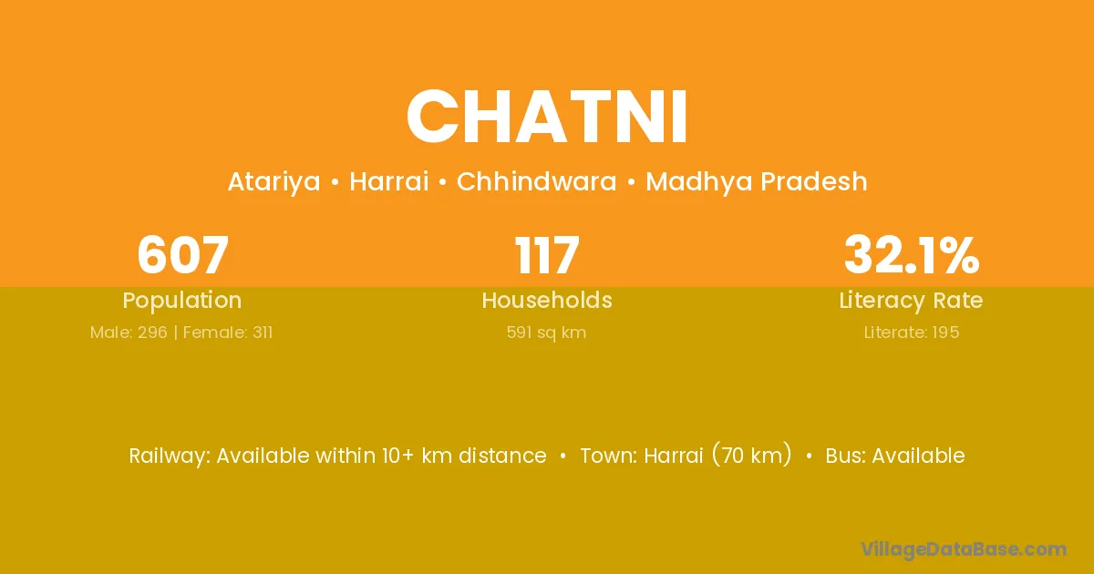 The literacy rate of Chatni village is 5.56%. Male literacy stands at 5.88% and female literacy at 5.26%.