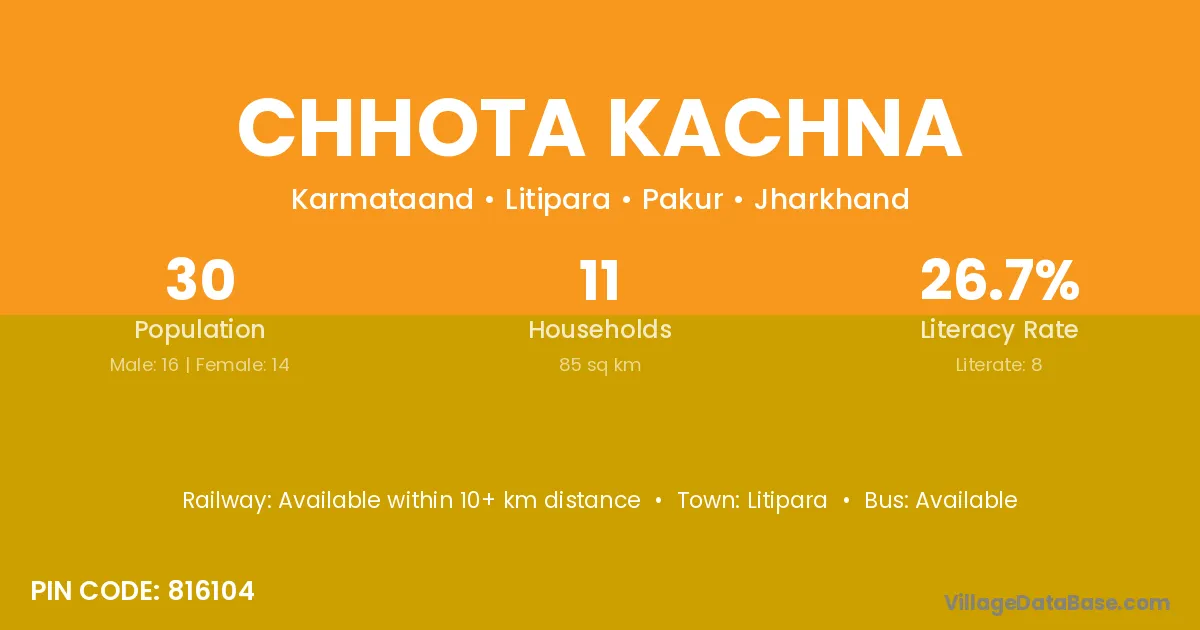 The literacy rate of Chhota Kachna village is 26.67%. Male literacy stands at 43.75% and female literacy at 7.14%.