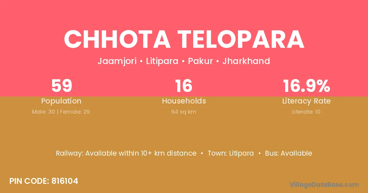 Chhota Telopara village has a total population of 59 people, of which 30 are males and 29 are females.