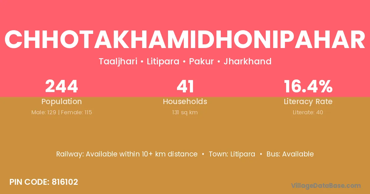 The literacy rate of Chhotakhamidhonipahar village is 16.39%. Male literacy stands at 22.48% and female literacy at 9.57%.