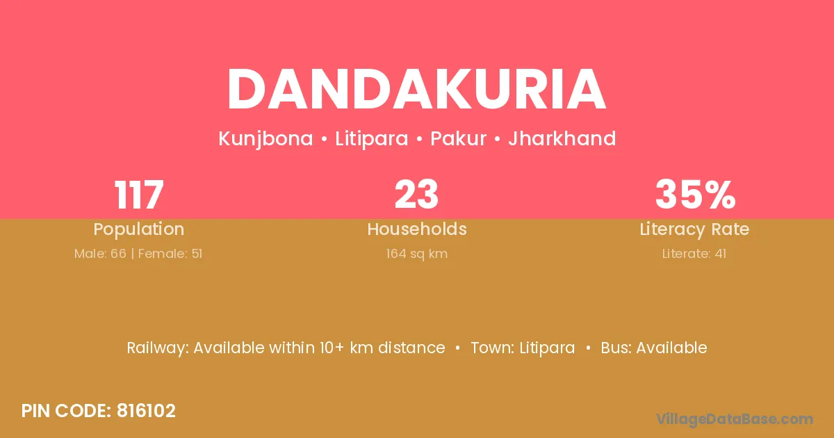 Dandakuria village has a total population of 117 people, of which 66 are males and 51 are females.