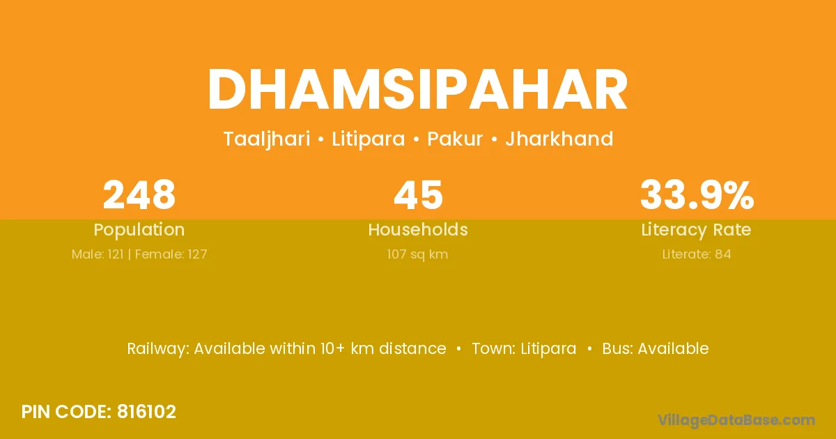 Dhamsipahar village has a total population of 248 people, of which 121 are males and 127 are females.