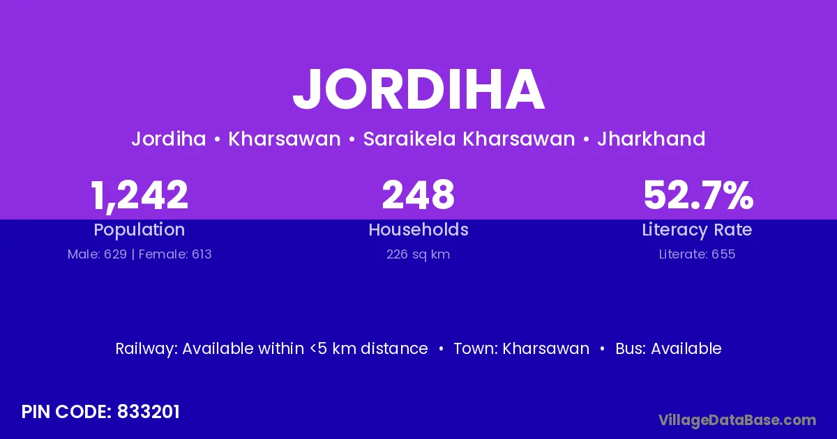 The literacy rate of Jordiha village is 42.84%. Male literacy stands at 55.91% and female literacy at 29.97%.