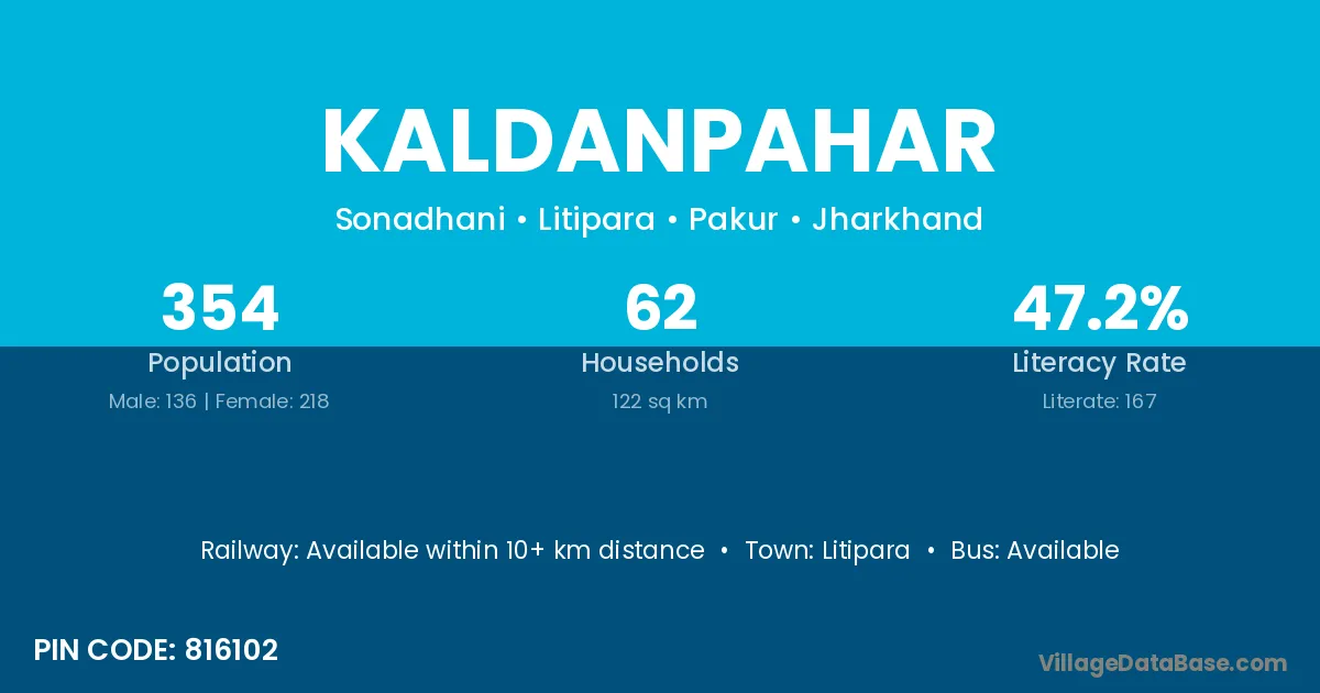 The literacy rate of Kaldanpahar village is 47.18%. Male literacy stands at 40.44% and female literacy at 51.38%.