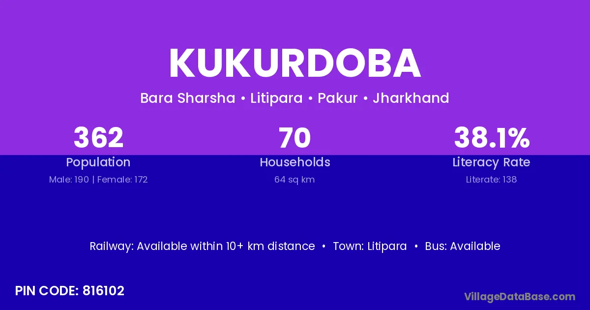 The literacy rate of Kukurdoba village is 38.12%. Male literacy stands at 47.37% and female literacy at 27.91%.
