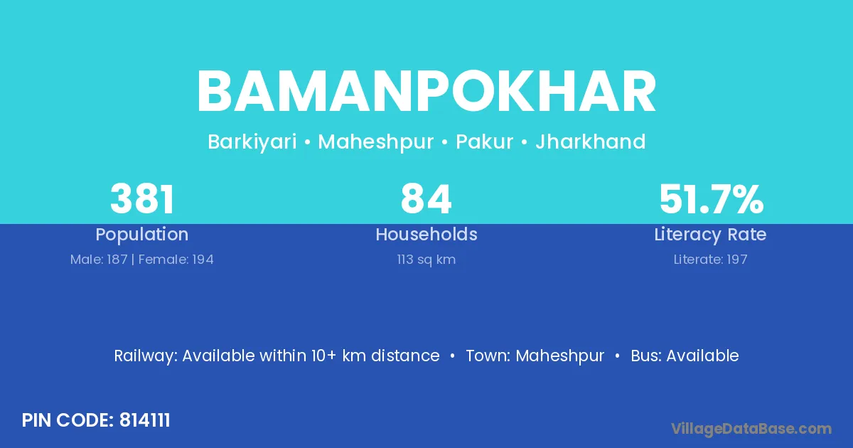 Bamanpokhar village has a total population of 381 people, of which 187 are males and 194 are females.