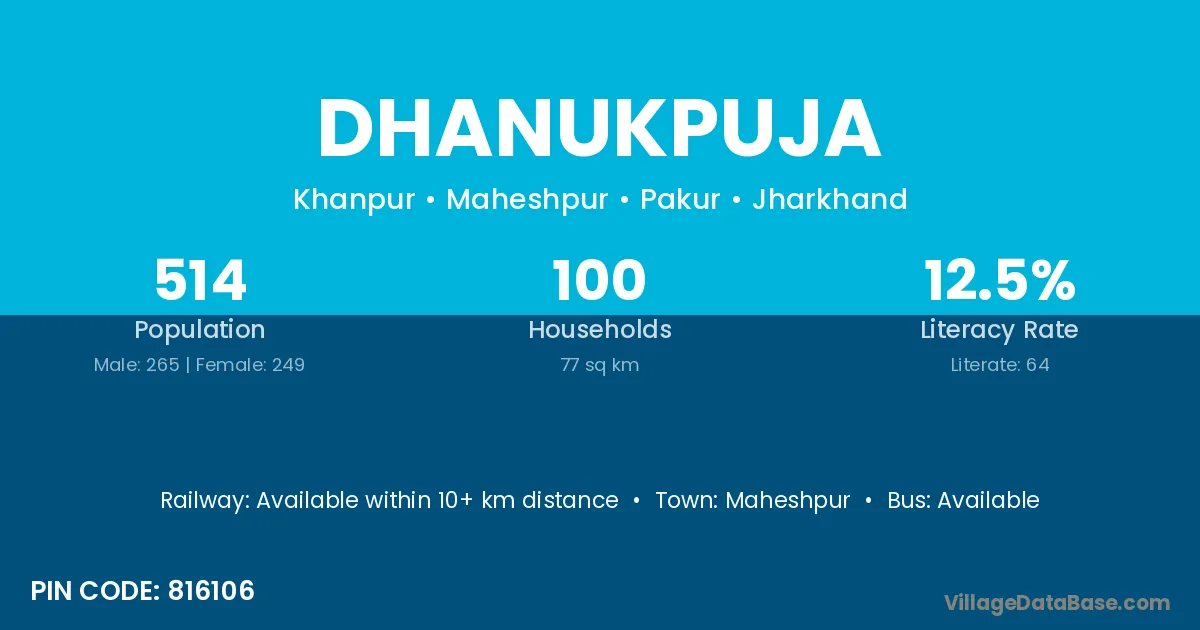 The literacy rate of Dhanukpuja village is 12.45%. Male literacy stands at 16.60% and female literacy at 8.03%.