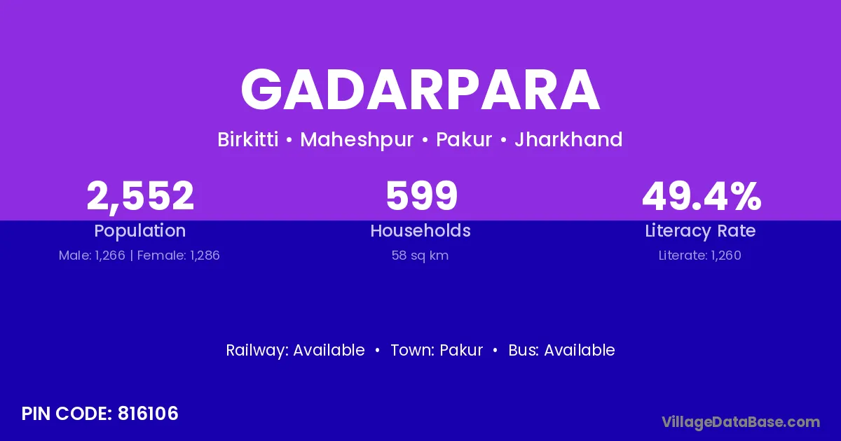 Gadarpara village has a total population of 2,552 people, of which 1,266 are males and 1,286 are females.