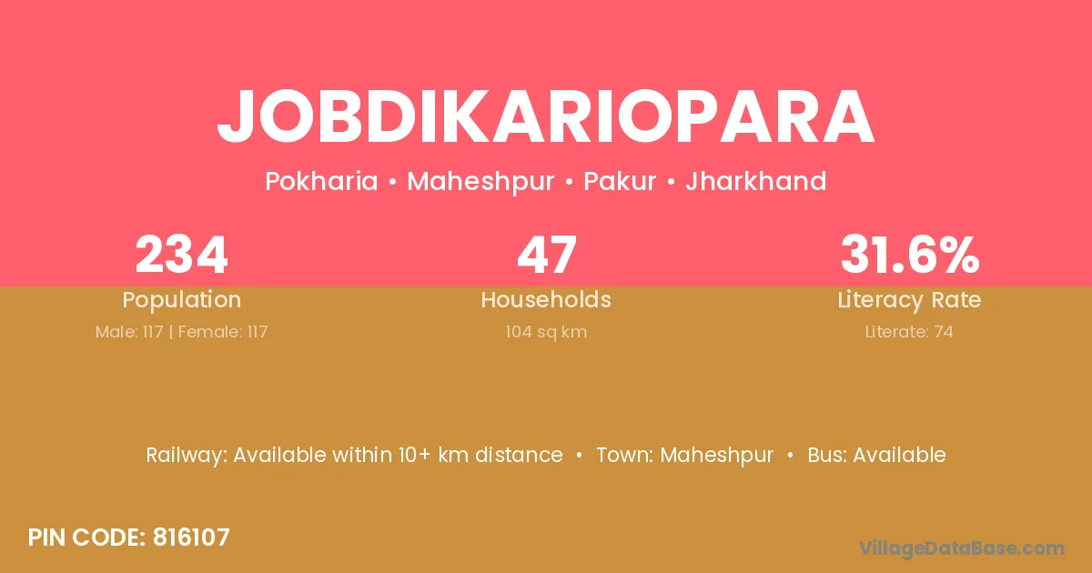 Jobdikariopara village has a total population of 234 people, of which 117 are males and 117 are females.