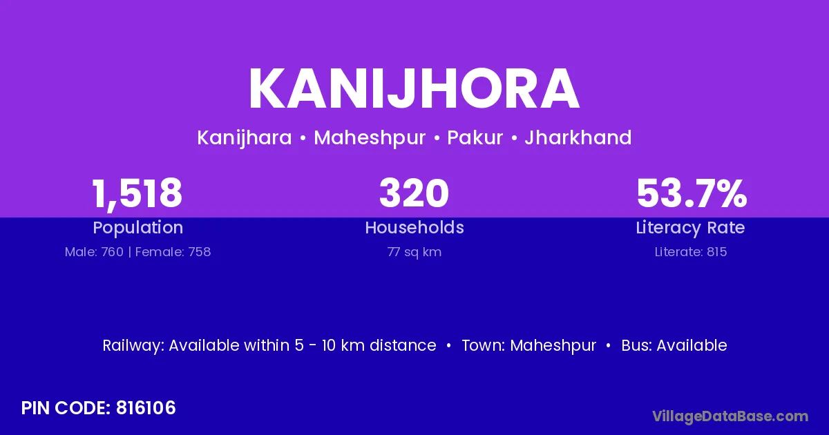 Kanijhora village has a total population of 1,518 people, of which 760 are males and 758 are females.