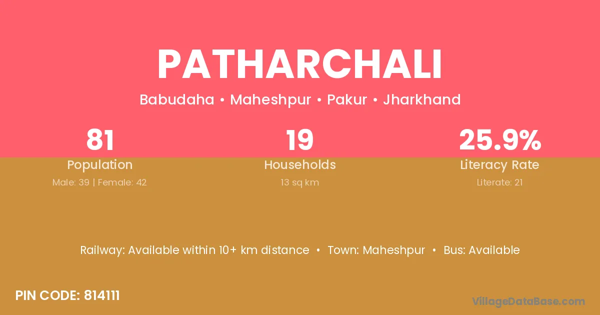 The literacy rate of Patharchali village is 25.93%. Male literacy stands at 38.46% and female literacy at 14.29%.