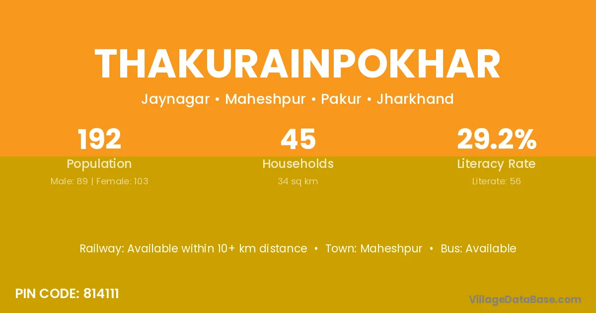 Thakurainpokhar village has a total population of 192 people, of which 89 are males and 103 are females.