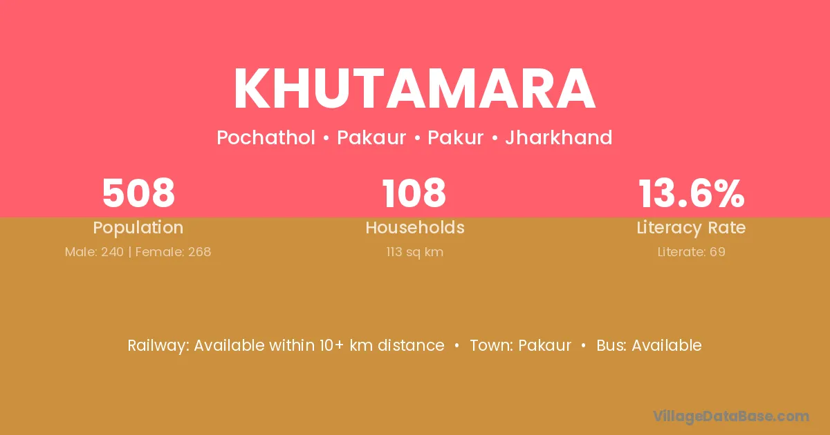 Khutamara village has a total population of 508 people, of which 240 are males and 268 are females.
