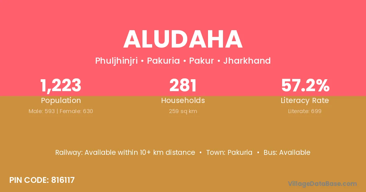 Aludaha village has a total population of 1,223 people, of which 593 are males and 630 are females.