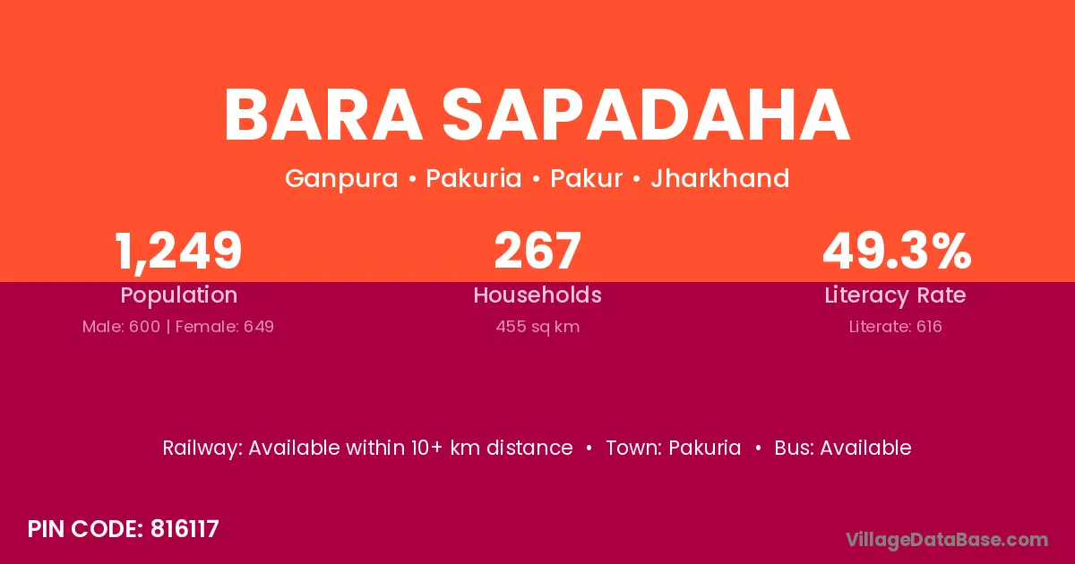 Bara Sapadaha village has a total population of 1,249 people, of which 600 are males and 649 are females.