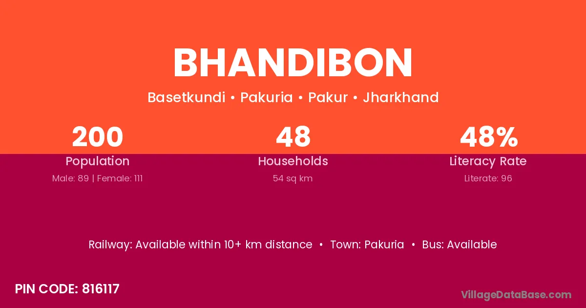 The literacy rate of Bhandibon village is 48.00%. Male literacy stands at 60.67% and female literacy at 37.84%.