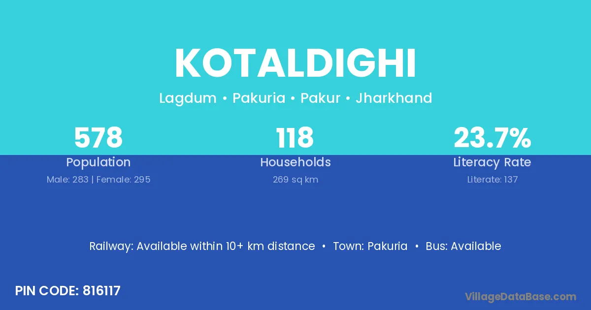 Kotaldighi village has a total population of 578 people, of which 283 are males and 295 are females.