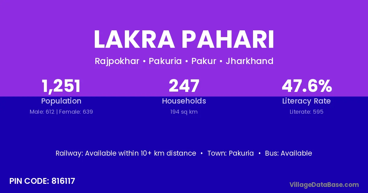 Lakra Pahari village has a total population of 1,251 people, of which 612 are males and 639 are females.