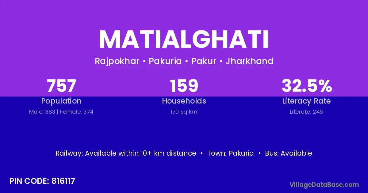 Matialghati village has a total population of 757 people, of which 383 are males and 374 are females.