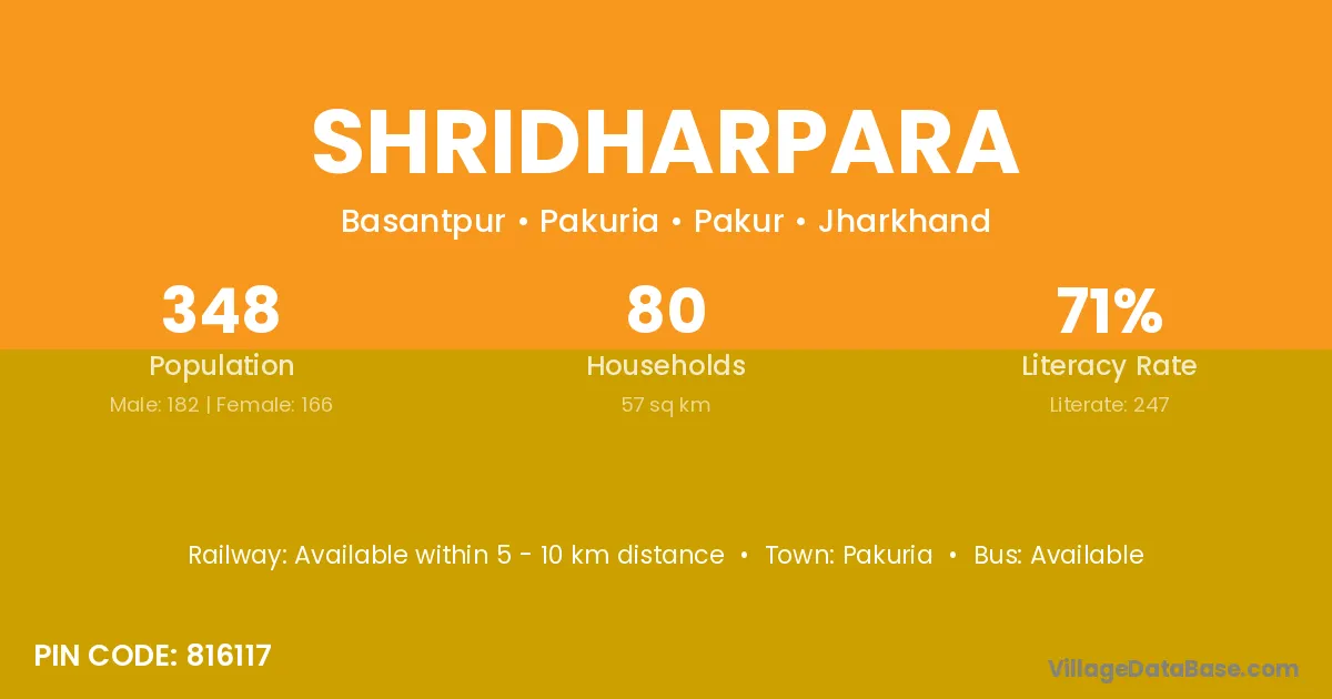 Shridharpara village has a total population of 348 people, of which 182 are males and 166 are females.
