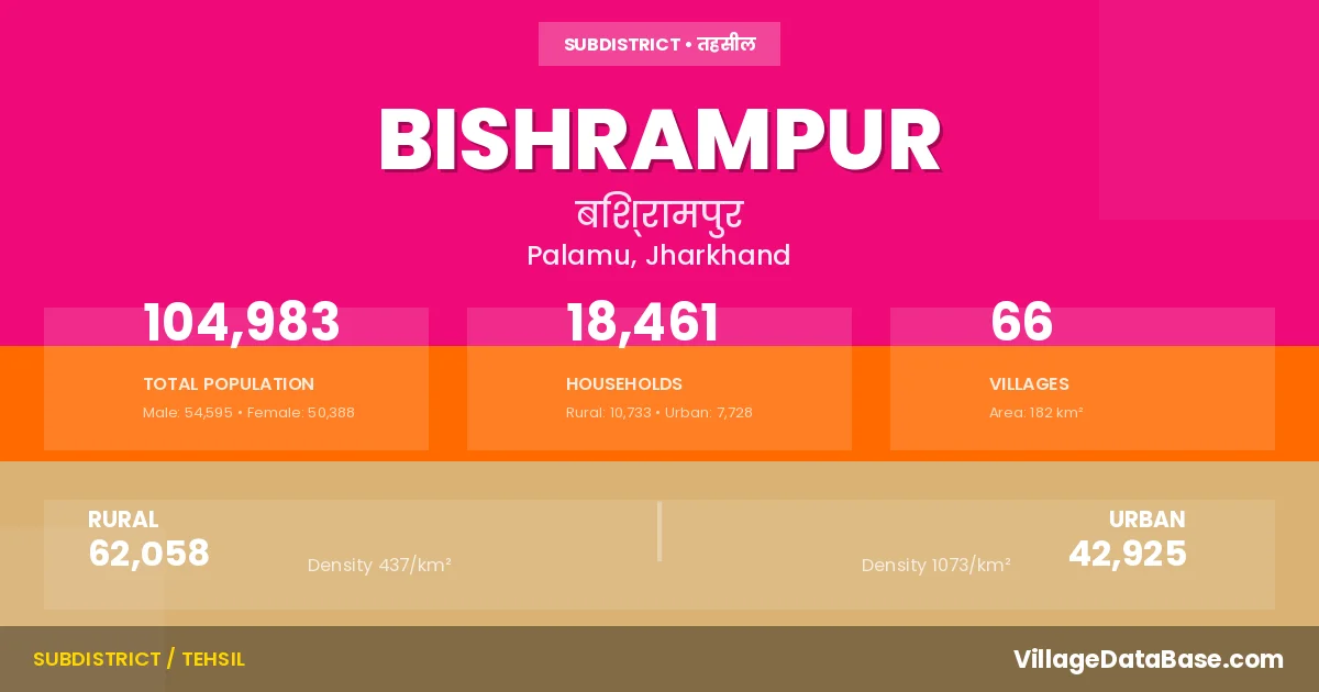 According to the 2011 census The total area of Bishrampur Subdivision is 182 km², with a population of 104983 people. The population density is 577 inhabitants per square kilometre, and there are approximately 18461 houses in the sub district.
