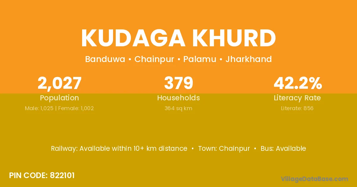 Kudaga Khurd village has a total population of 2,027 people, of which 1,025 are males and 1,002 are females.