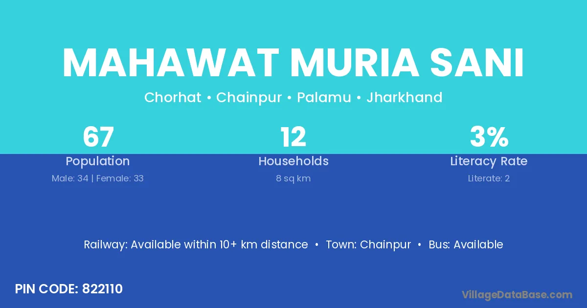 Mahawat Muria Sani village has a total population of 67 people, of which 34 are males and 33 are females.