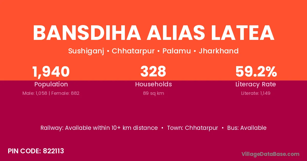 Bansdiha Alias Latea village has a total population of 1,940 people, of which 1,058 are males and 882 are females.